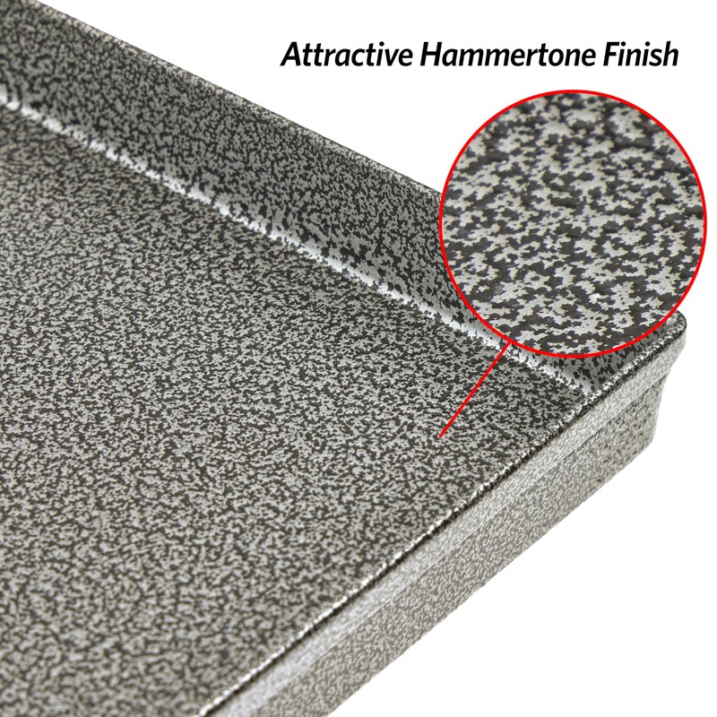 - Leak proof metal replacement pan made of a leak proof welded seam and rust resistant powder coat finish with heavy duty durable metal construction