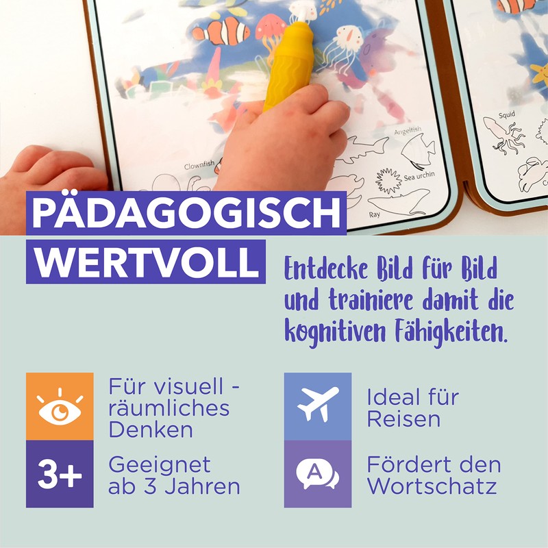 - Great activity for children: whether at home, on the car journey, on the plane or on holiday – the colouring book with water pen is a wonderful toy for children aged 3 and over thanks to its practical size
