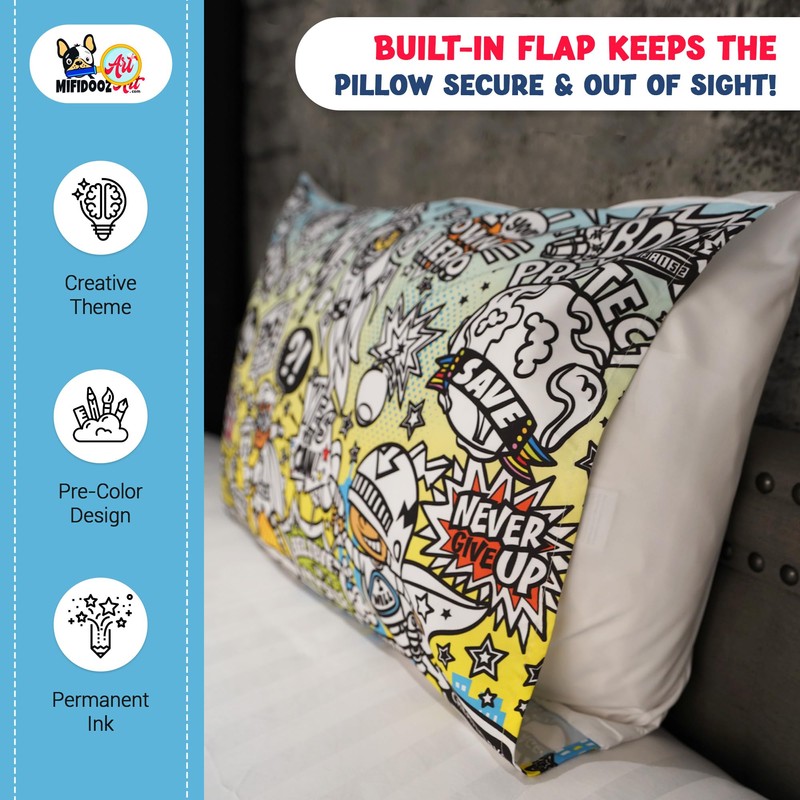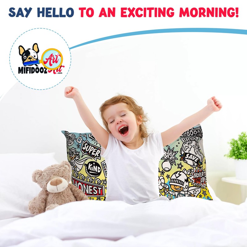 - Transform your pillow into a shield of motivation - with Mifidoozart superheroes who send inspiring messages like "I believe in myself," and "I will never give up" to encourage children to build their self-confidence. Color the blank spaces to personalize your pillow and add even more courage to your dreams. It’s the perfect gift to inspire young heroes to shine!
