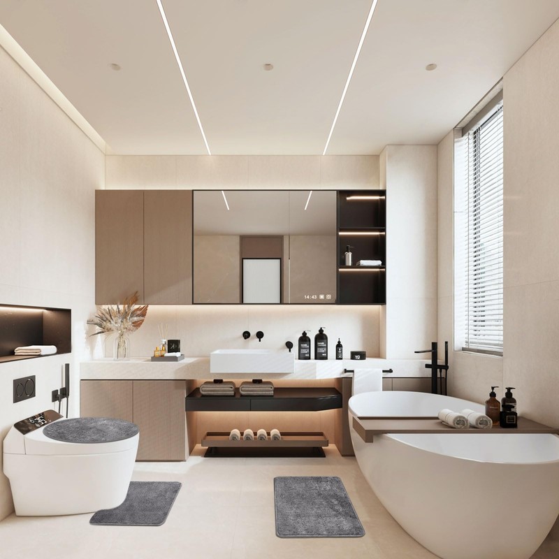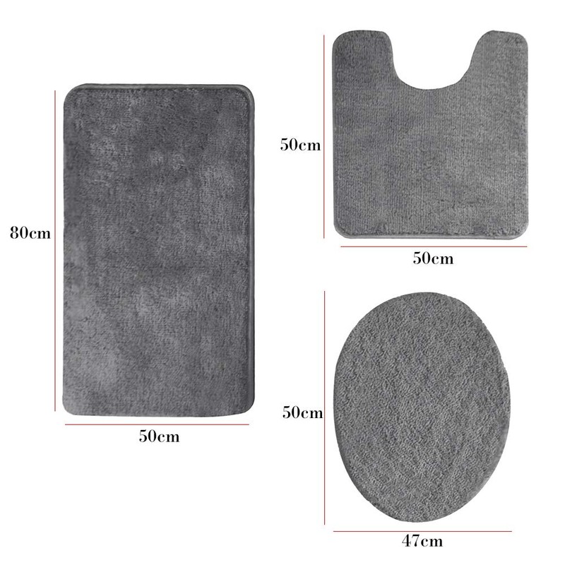 - 【Bathroom Rug Set 3 Piece】Bathroom Rug Set 3 pieces include 1 x Rectangular Bath Mat (50*80cm/20*31in), 1 x U Shape Mat (50*50cm/20*20in), 1 x Toilet Seat Cover (47*50cm/18*20in). Solid color and simple modern style, great for bathroom decor and also protect your floor and toilet lid.