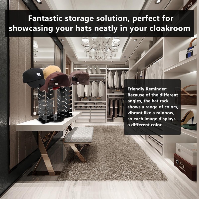 - LARGE ORGANIZATION CAPACITY: The hat rack can help you put all your baseball caps in one place and say goodbye to hat clutter. It keeps the shape of the hats well, avoiding the trouble of messy and deformed hats, rotating the display rack can find the hats quickly.