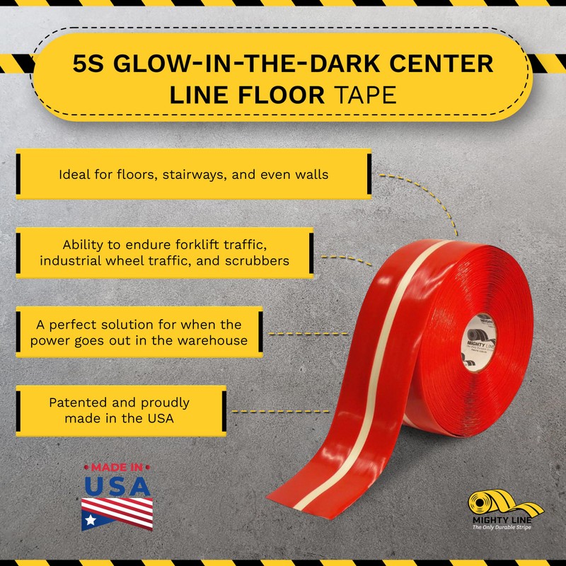 Mighty Line Floor Tape is the ultimate solution for industrial floor marking, designed to withstand the toughest conditions. With a 50 mil thickness, our floor mark tape is 7 times thicker than average, ensuring exceptional durability. Crafted to endure heavy foot traffic and forklift operations, Mighty Line floor tape is synonymous with resilience and reliability. An ideal 5s floor marking tape, for lean manufacturing, Six Sigma, and various floor marking applications, our caution floor tape enhances workplace safety and efficiency. Our advanced flooring adhesive tape not only meets essential safety standards but also elevates workplace safety and operational efficiency. By complying with OSHA and ANSI specifications, Mighty Line safety caution tape ensures clear risk identification and traffic guidance, crucial for maintaining a safe and organized workplace. Installation and maintenance are remarkably straightforward, leaving little to no residue behind. The Mighty Line Glow adhesive reflective tape roll with a reflective center line is a great solution when areas of your warehouse get too dark. This heavy duty reflective tape helps trucks backing up to a dock to load and unload at night, and is also ideal for low light conditions throughout a workspace. Proudly manufactured in the United States, Mighty Line safety floor tape adheres to stringent quality standards, supporting the local economy while delivering superior performance. Each tape is built to last, providing a reliable and long-lasting solution for all your industrial floor marking needs. Our floor tape's versatility extends beyond industrial applications to educational settings, creative spaces, warehouses, manufacturing, retail, government buildings, universities, and more.