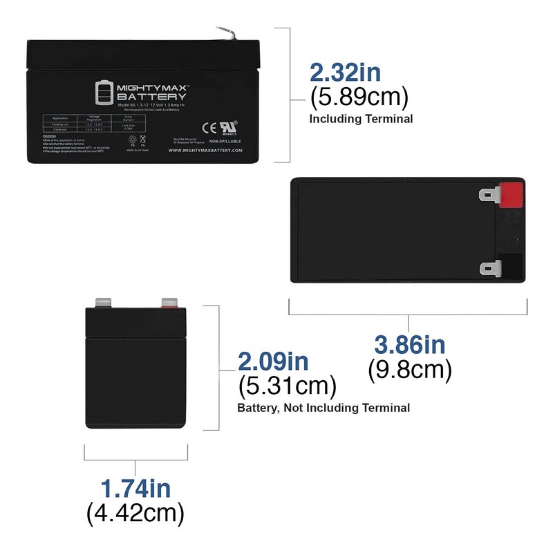 - Dimensions: 3.86 inches x 1.74 inches x 2.32 inches. Terminal: F1. Listing is for the Battery only. No wire harness or mounting accessories included.