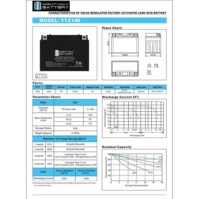 • YTZ14S is a 12V 11.2AH 230 Cold Cranking Amps (CCA) Sealed Lead Acid (SLA) Battery