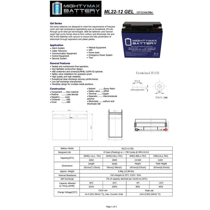 - ML22-12GEL is a 12V 22AH GEL rechargeable maintenance free battery. 2 Pack