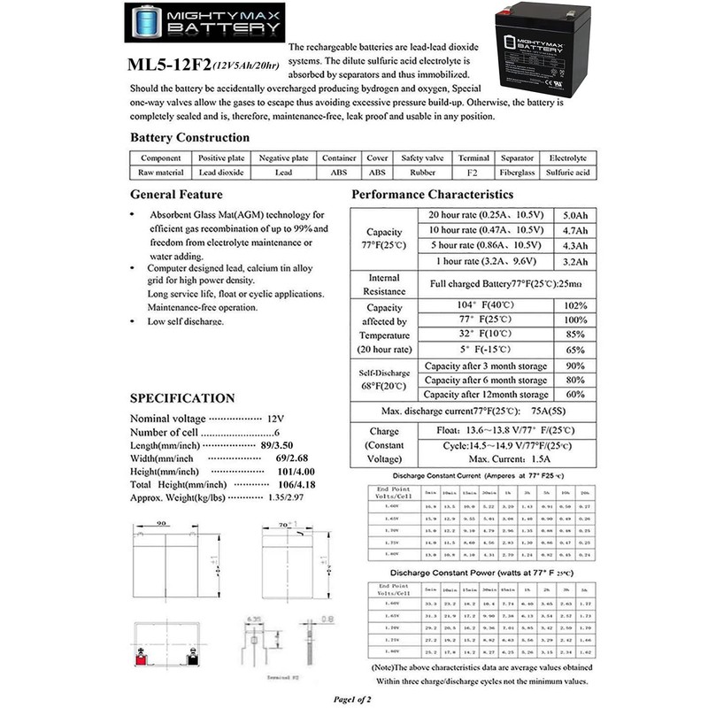 - ML5-12F2 SLA is a 12V 5AH Sealed Lead Acid (SLA) rechargeable maintenance free battery, Pack of 9 - UL Certified