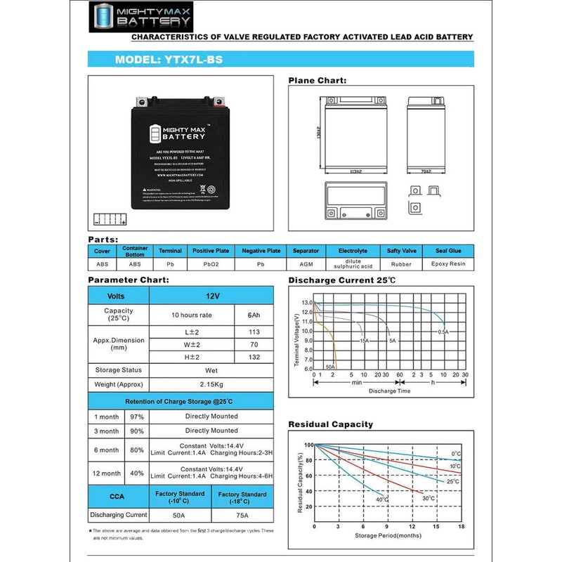 - YTX7L-BS is a 12V 6AH 100 Cold Cranking Amps (CCA) Sealed Lead Acid (SLA) Battery. Pack of 8.