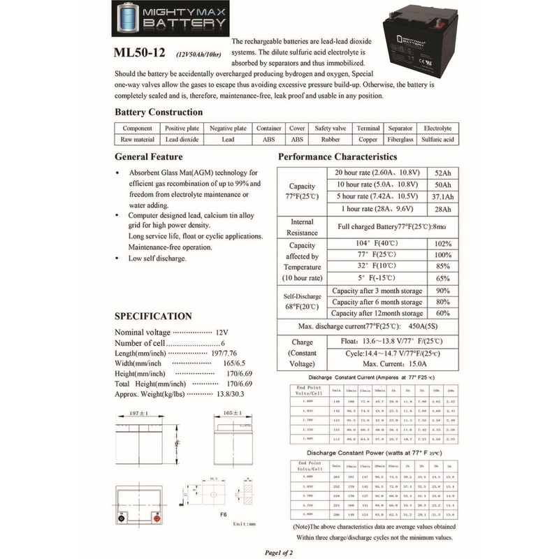 - ML50-12 SLA is a 12V 50AH Sealed Lead Acid (SLA) rechargeable maintenance free battery - UL Certified