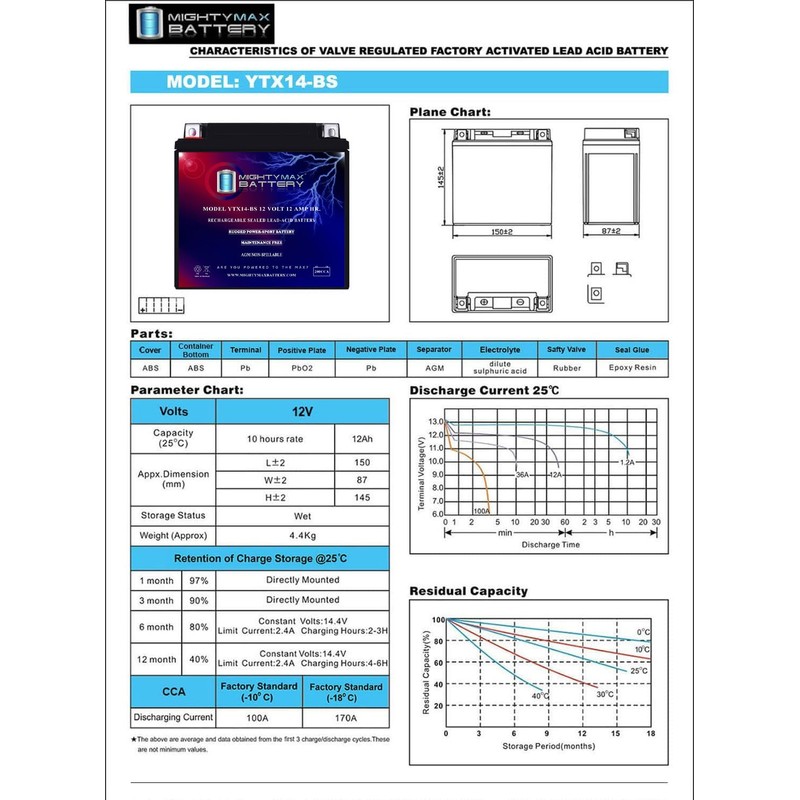 - YTX14-BS is a 12V 12AH 200 Cold Cranking Amps (CCA) Sealed Lead Acid (SLA) Battery