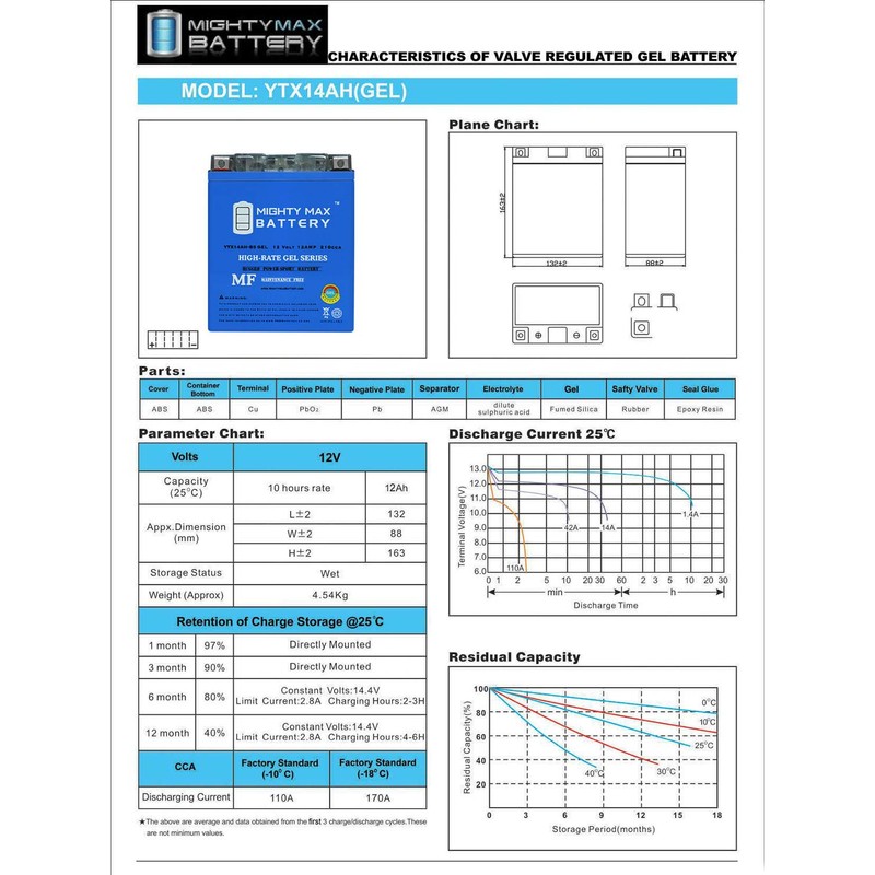 - YTX14AH GEL is a 12V 12AH 210 Cold Cranking Amps (CCA) GEL (Maintenance Free) Battery