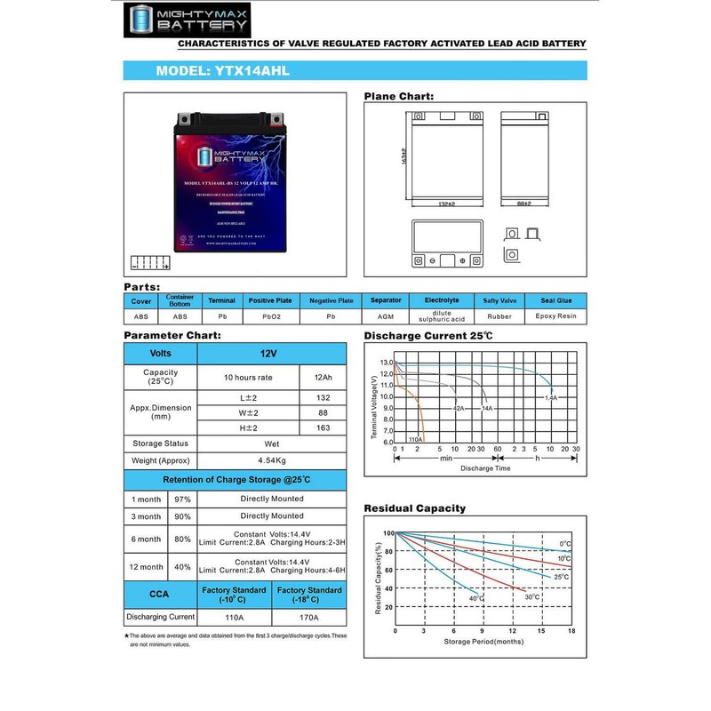 - YTX14AHL is a 12V 12AH 210 Cold Cranking Amps (CCA) Sealed Lead Acid (SLA) Battery