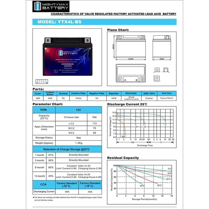 - YTX4L-BS is a 12V 3AH 50 Cold Cranking Amps (CCA) Sealed Lead Acid (SLA) Battery. Pack of 3.