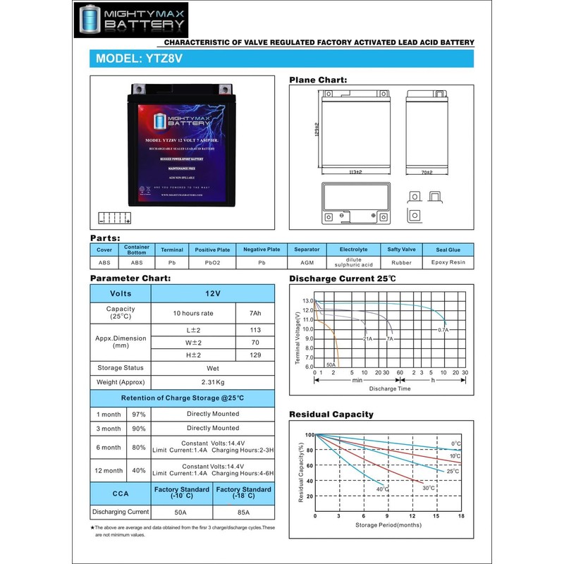 - YTZ8V is a 12V 7AH 85 Cold Cranking Amps (CCA) Sealed Lead Acid (SLA) Battery