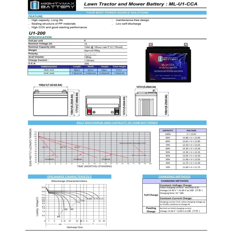 This ML-U1-CCA 12 volts 200 CCA absorbed glass mat (AGM) battery is made with the highest quality pure virgin lead (99.99%) to create a long lasting, durable power source for any machinery requiring a cold cranking power source.