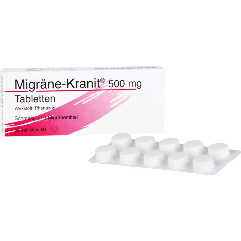 Migräne-Kranit 500 mg Tabletten. Wirkstoff: Phenazon. Anwendungsgebiete: zur akuten Behandlung der Kopfschmerzen von Migräneanfällen mit und ohne Aura und bei leichten bis mäßig starken Schmerzen.