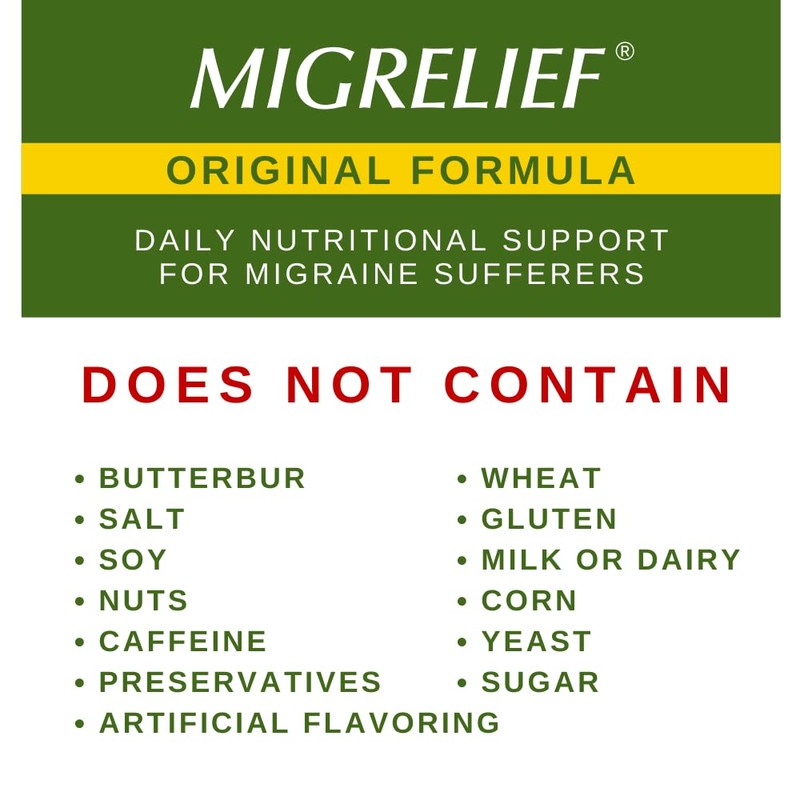 - #1 nutritional option for migraine sufferers, safe & effective - MigreLief is non-prescription, vegetarian, drug free, caffeine free and non-GMO. Does not contain butterbur, wheat, gluten, salt, soy, milk or dairy, nuts, corn, caffeine, artificial flavorings or preservatives.