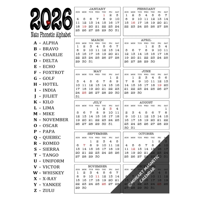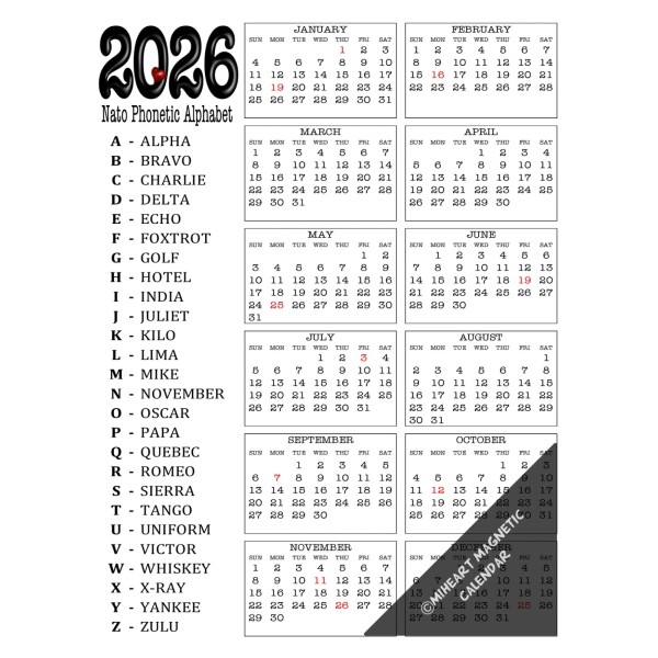 MiHeart 2026 - 12 Month MiHeart Magnetic Refrigerator Calendar 8.5"x11" (Nato Phonetic)