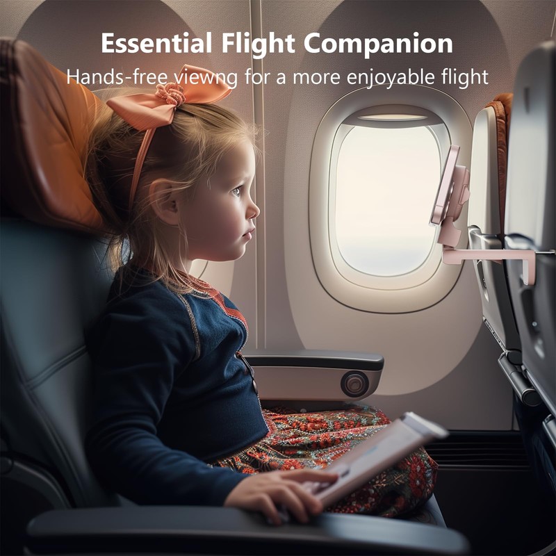 Upgraded 2-in-1 Airplane Phone Holder in charming pink, featuring suction cup and magnetic attachment capabilities for instant phone fixation, freeing your hands during air travel for an effortless journey. Its foldable, compact design effortlessly slips into pockets, backpacks, or luggage for convenient portability. The clamp-style design below allows for versatile placement on airplane tray tables, luggage handles, desks, beds, kitchen cabinets, bookshelves, and chairs. With 360-degree rotation support, enjoy optimal viewing angles from any position. The pink hue adds a feminine touch, perfect for travel companions and besties on adventures together.