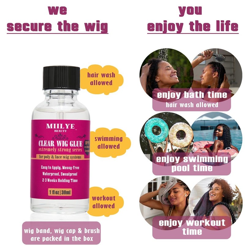 - Swimming Allowed Waterproof Clear Wig Glue for Front Lace Wigs: MIILYE BEAUTY wig glue can firmly secure your lace wigs in place for 2 to 3 weeks, with its special formula, this wig glue allows you to enjoy swimming with your wig on, also the bonding area will not turn white after getting wet;