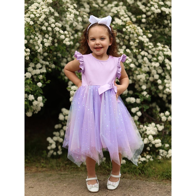 Miipat Toddler Girls Tulle Dress Flutter Sleeve Princess Party Dress Little Kids Fluffy Tutu Sundress(Purple,5-6Years)