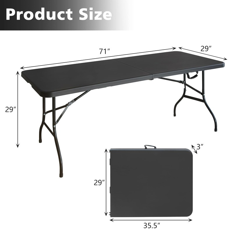 - 【Practical & Lightweight】The 6ft folding table Unfolded dimensions: 72.8"(L) x 29.9"(W) x 29.1"(H); Folded dimensions: 29.92"(L) x 49.61"(W) x 3.94"(H); Maximum Weight Capacity: 300 LB. Item Weight: 18.74 LB. It does not require assembly and can be opened and folded in a few seconds, suitable for adults and children.