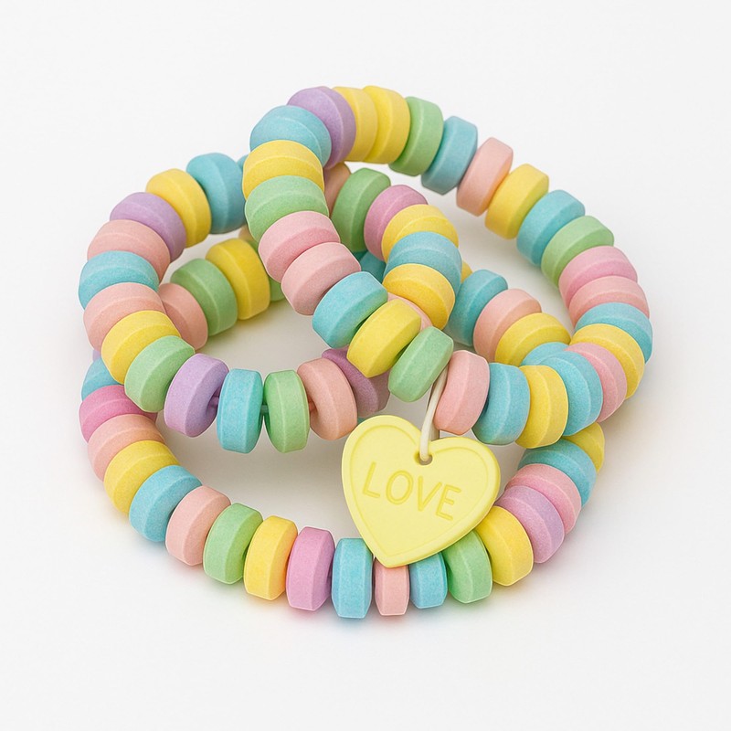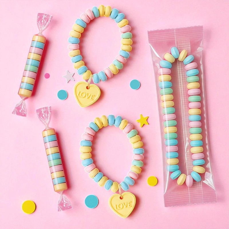 - Sweets to put on. Who does not remember the joy of wearing a bracelet and having to snack at the same time. This set brings the classics back to today