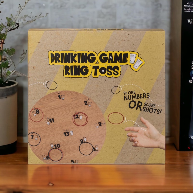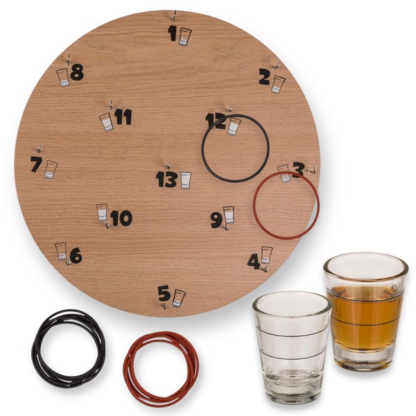 - Simple rules, huge fun. Material: wood, glass. Contents: wooden hanging board, 12 rings, 2 shot glasses.