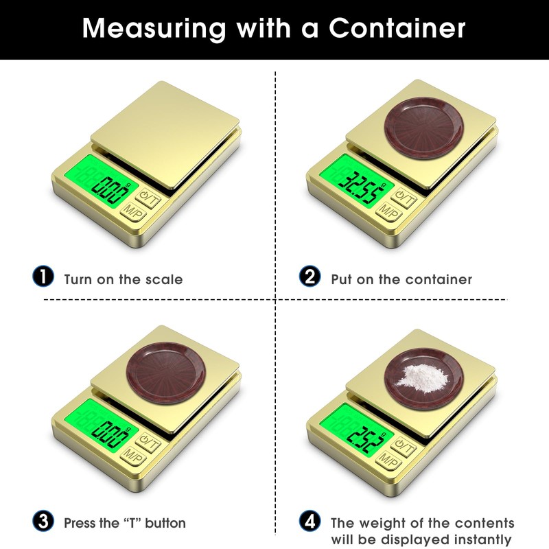- 【Practical Design】Press the tare button after putting into the container to get the net weight of the item being weighed. Big bright LCD display easy to read. The cute gram scale to turn off after 3 minutes inactivity.