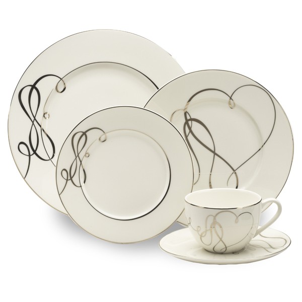 Celebrate true love and timeless elegance with Love Story. The graceful bands of platinum wind their way across each plate and feature delicate hearts on accent pieces, making this a classic dinnerware pattern to be treasured for anniversaries to come. Perfect for upscale entertaining. Made of high quality porcelain. Dishwasher safe. Do not use in microwave. When washing gold or platinum banded dinnerware in the dishwasher, use a gentle cycle and turn off the dishwasher before the drying cycle, or allow the dinnerware to cool before handling it. The high temperature of the heated drying cycle can cause the precious metal bands to soften. 5 piece place setting includes a 10-3/4 inch dinner plate, 8-1/2 inch salad plate, 7 inch bread & butter plate, 10 ounce tea cup & 6-1/2 inch saucer.