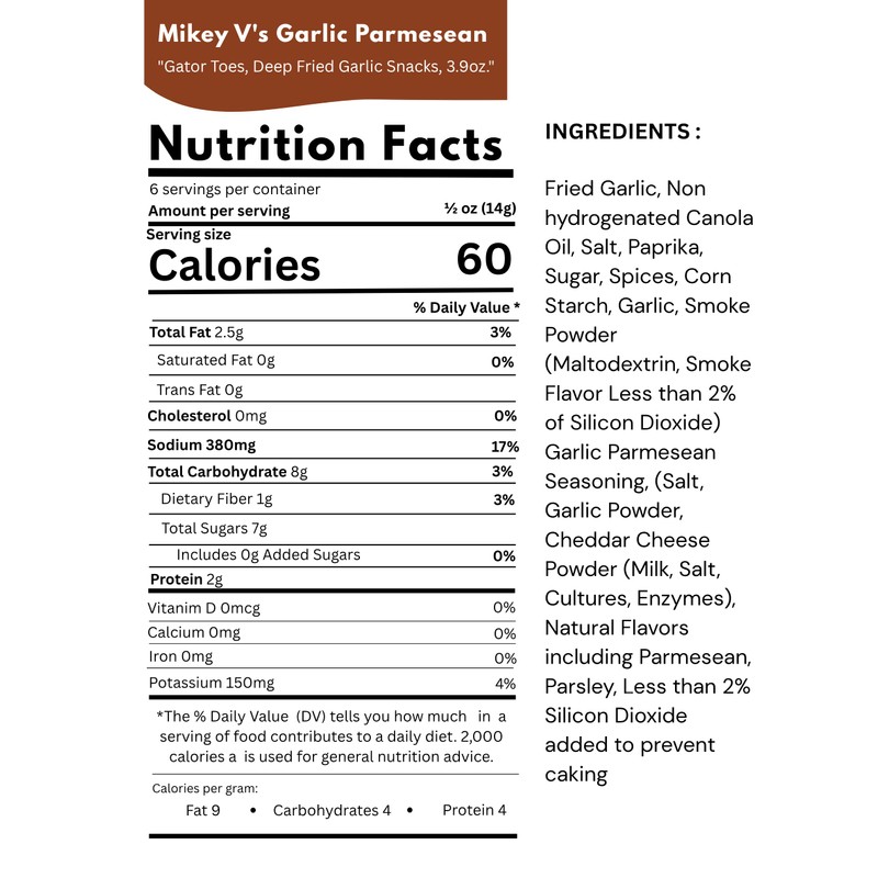Mikey V's Garlic Parmesan Gator Toes - Fried Garlic Snack (4oz). Looking for a unique, flavorful snack? Mikey V's Garlic Parmesan Gator Toes are deep-fried garlic seasoned to perfection with a rich garlic flavor and a savory parmesan kick. These crunchy bites are not only a delicious snack on their own, but they also make an excellent crouton substitute for salads, soups, or even as a topping for pasta dishes. Key Features: Bold Flavor: Infused with garlic and parmesan seasoning for an irresistible taste. Versatile: Enjoy them straight out of the bag or add them to your favorite dishes for extra crunch. Made in Texas: Handcrafted with love in Texas by Mikey V's. Whether you're a garlic lover or just looking for a tasty snack with a unique twist, these fried garlic snacks are sure to satisfy your cravings! Size: 4-ounce resealable bag, perfect for snacking on the go.