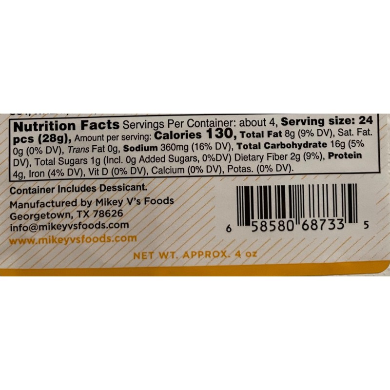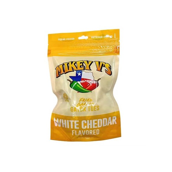 Mikey V's White Cheddar Gator Toes - Fried Garlic Snack (4oz). Looking for a unique, flavorful snack? Mikey V's White Cheddar Gator Toes are deep-fried garlic seasoned to perfection with a rich garlic flavor and a savory white cheddar kick. These crunchy bites are not only a delicious snack on their own, but they also make an excellent crouton substitute for salads, soups, or even as a topping for pasta dishes. Key Features: Bold Flavor: Infused with garlic and white cheddar seasoning for an irresistible taste. Versatile: Enjoy them straight out of the bag or add them to your favorite dishes for extra crunch. Made in Texas: Handcrafted with love in Texas by Mikey V's. Whether you're a garlic lover or just looking for a tasty snack with a unique twist, these fried garlic snacks are sure to satisfy your cravings! Size: 4-ounce resealable bag, perfect for snacking on the go.