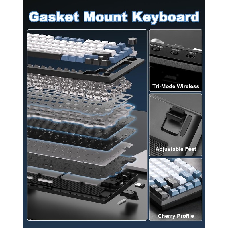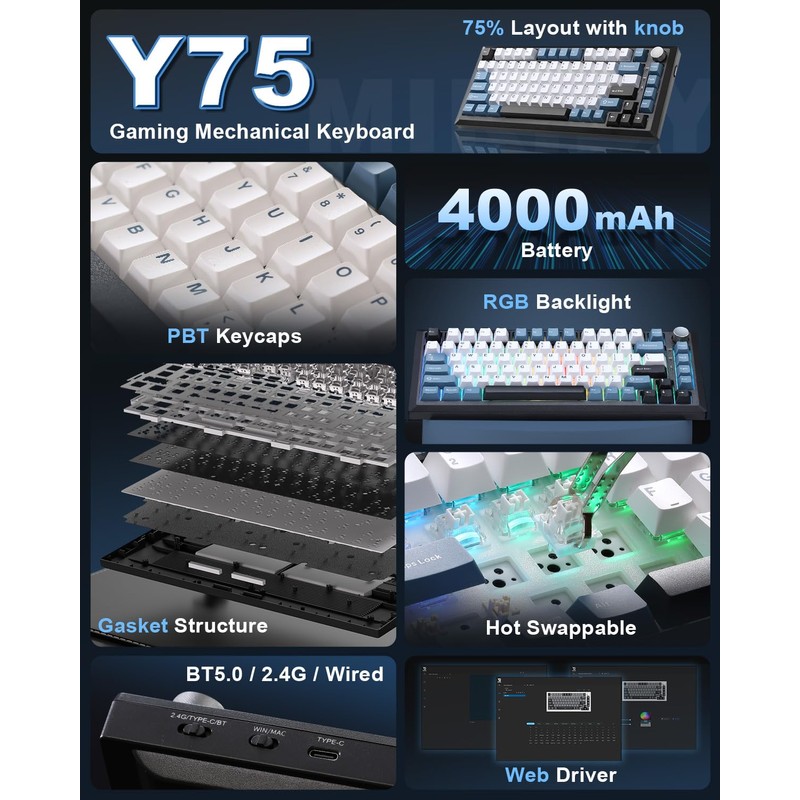 MIKIBY Y75 Wireless Mechanical Keyboard,75% Hot Swappable Custom Keyboard with Knob,RGB Backlit, PBT Keycaps,2.4GHz/USB-C/BT5.0 Mechanical Gaming Keyboards(Black&Blue,Milk Switch)