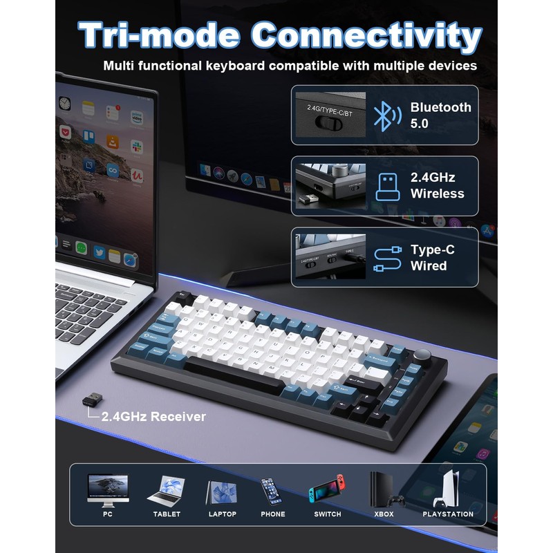 - Tri-mode Connection Gaming Keyboard : Wireless mechanical keyboards work with Bluetooth 5.0 , ultra-fast 2.4GHz wireless, and USB-C wired mode.(Can connect 5 devices at the same time).The bluetooth keyboard suit for PC, laptop, tablet, phone, PS5, Xbox, and more—consolidate all your devices with one keyboard