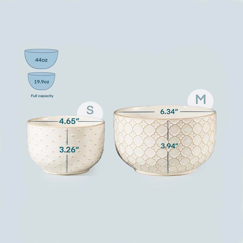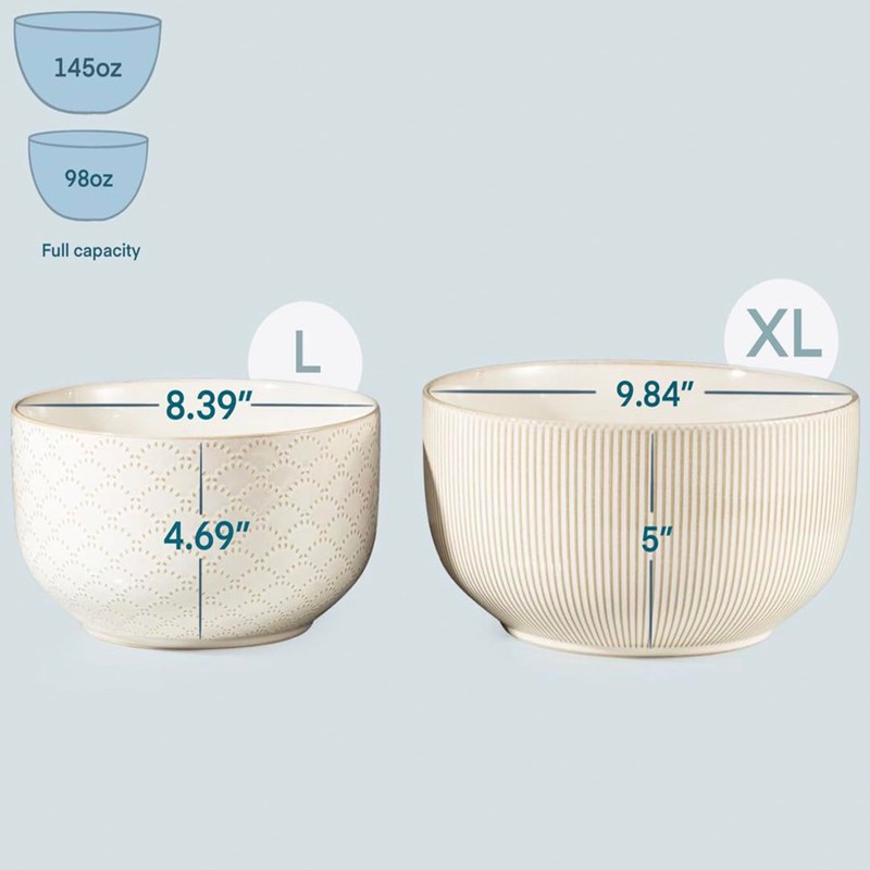 MIKIGEY Mikiegy Ceramic Mixing Bowls Set of 4, Nesting Ceramic Embossment Stoneware Mixing Bowls for Cooking, Serving, Popcorn, Salad etc, Microwave & Dishwasher Safe, 20/44/98/145 oz, Off-White