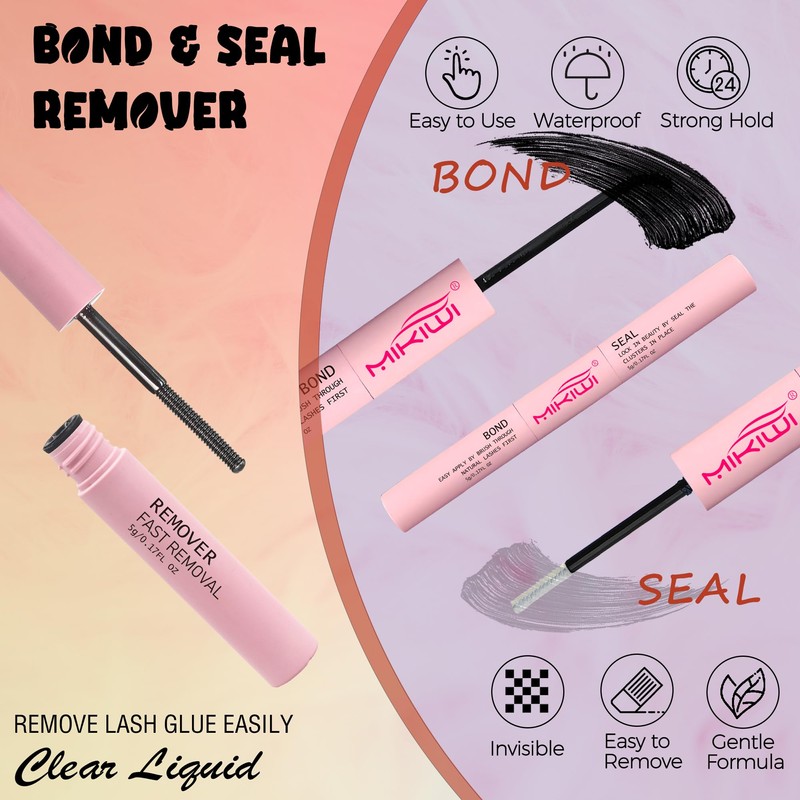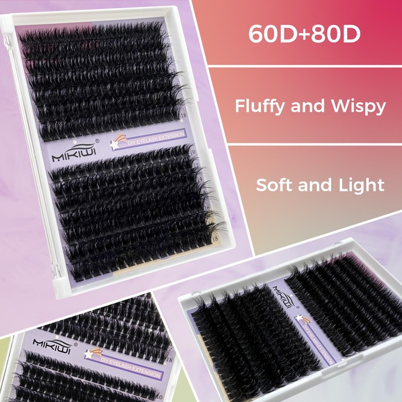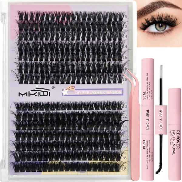 MIKIWI Lash Clusters Kit Fluffy 60D+80D Eyelash Extension Kit 280PCS Wispy Lash Clusters with Waterproof Lash Bond & Seal, Lash Remover, Lash Applicator