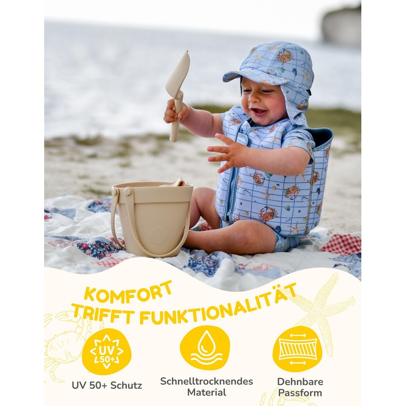 The mikk-line lightweight sun hat has been specially designed for babies and toddlers to provide maximum comfort and protection on sunny days. With its clever design, the hat not only protects the head, but also the sensitive neck area from direct sunlight. A small peak on the front provides shade for face and eyes, while the extended back covers the neck. Thanks to the soft ties, the hat stays reliably on the head even in wind or movement - ideal for active children. The material is breathable, elastic and quick-drying - ideal for hot days, trips to the water or long summer days outdoors. The high-quality workmanship ensures long durability, even with frequent wear and washing. The simple, Scandinavian design makes the sun hat a real all-rounder for the summer wardrobe - whether on the beach, on the playground or in the garden. Note: The sun hat reliably protects against direct sunlight thanks to its shape and the material used.