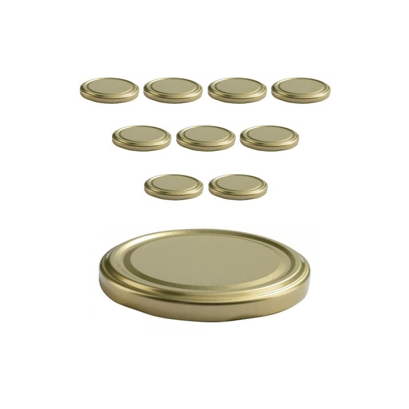- 10 gold-coloured screw lids for jam jars, preserving jars TO 82, with an outer opening diameter without thread approx. 77.4mm Outer diameter of the lid 8.5 cm.