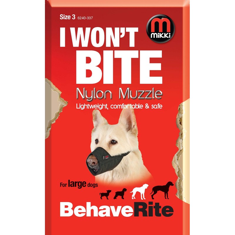 • ADJUSTABLE - the Mikki Nylon Muzzle has an adjustable strap with 'quick fit' snap lock and a collar attachment to help prevent removal by the dog