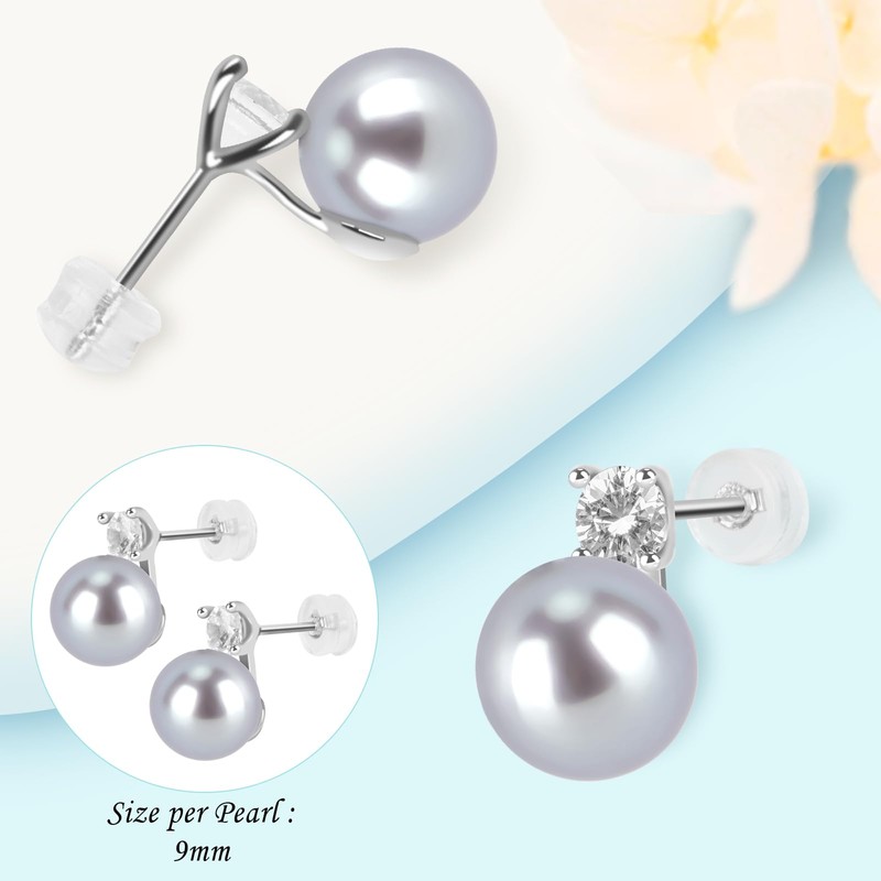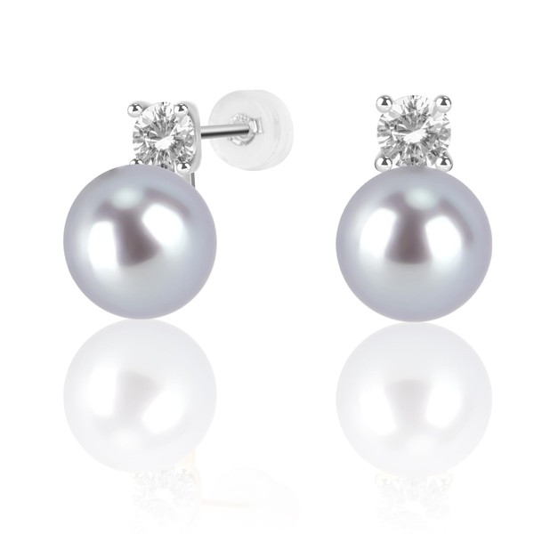 MIKOSTRA 925 Sterling Silver Post Cubic Zirconia 9mm Grey Round AAAAA+ Quality Handpicked Freshwater Cultured Stud Button Pearl Earrings Hypoallergenic with Genuine Cultured Pearls
