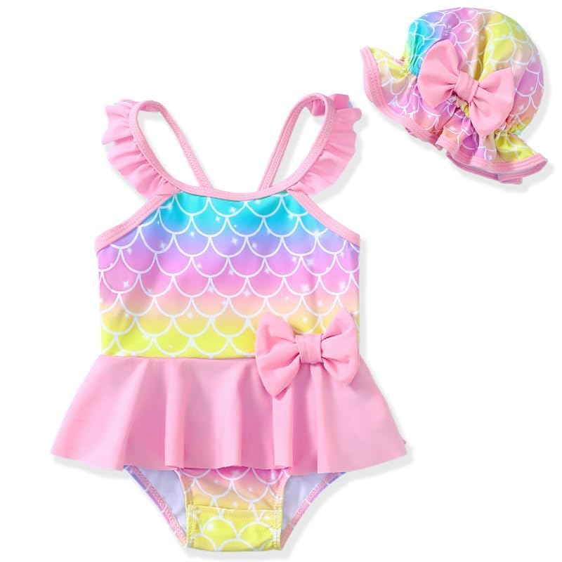 - Adorable Mermaid Scale Design: The baby One-Piece Swimsuit features a charming mermaid scale pattern in vibrant colors, including shades of pink, yellow, and blue. The playful design is sure to capture the imagination of little mermaids everywhere