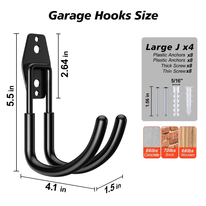 SIMPLE INSTALLATION:The garage wall hook is equipped with two types of screws and an operating manual. Can be installed on wooden walls, concrete walls, and gypsum walls. The load-bearing capacity of each wall is different