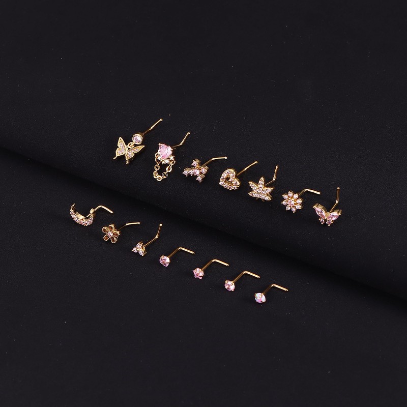 - Nose piercing stud set: one order contains 14 pieces nose piercing plugs for women in different styles: tiny CZ nose studs, gold silver, butterfly nose studs, flower nose ring, infinity nose studs, moon nose studs, heart nose ring, snowflake nose studs. A wide range of styles from classic to trendy for all ages and any occasion.