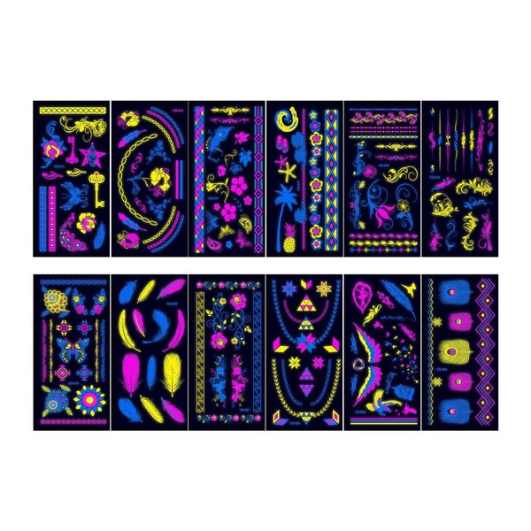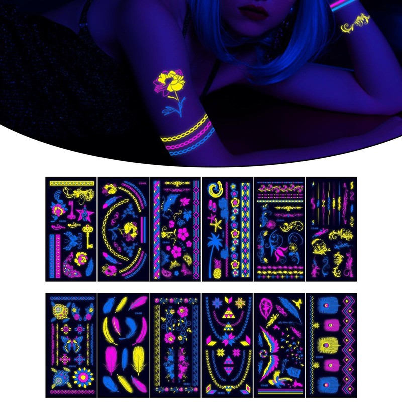 Milageto 12Pcs Glow in The Dark Tattoos React to Black Light Decorations Party Supplies Body Paint for Birthday Parties, Style A