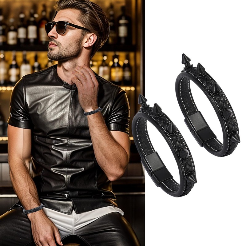 • Package include 2 Pcs Black PU Leather Bracelets, Punk Style with Studded Accent.