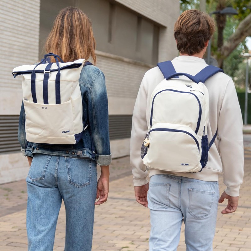 • Urban backpack with roll-up top closure that allows you to adjust its capacity to the contents. 1918 Series Beige with Navy Accents Inspired by the original colors and design of MILAN erasers, manufactured in Spain since 1918.