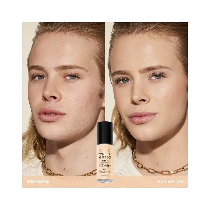 Milani Conceal & Perfect 2-in-1 Foundation and Concealer is a foundation and concealer in one. With this foundation you win the battle against every imperfection on your skin. Whether it's dark circles, red spots or other imperfections, with this full coverage waterproof 2-in-1 concealer and foundation you always work it away perfectly. Because of the handy pump mechanism you do not waste anything and you can dose perfectly for that perfect natural look.
