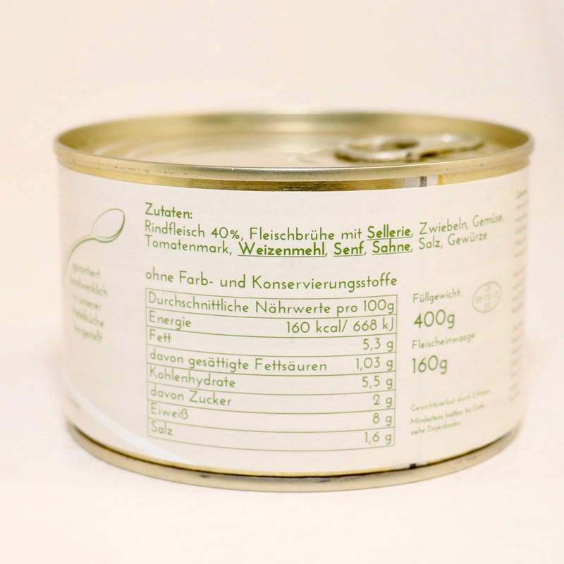 - Ingredients: beef 40%, meat broth with celery, onion, vegetables, milk, tomato paste, wheat flour, mustard, salt, spices