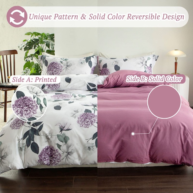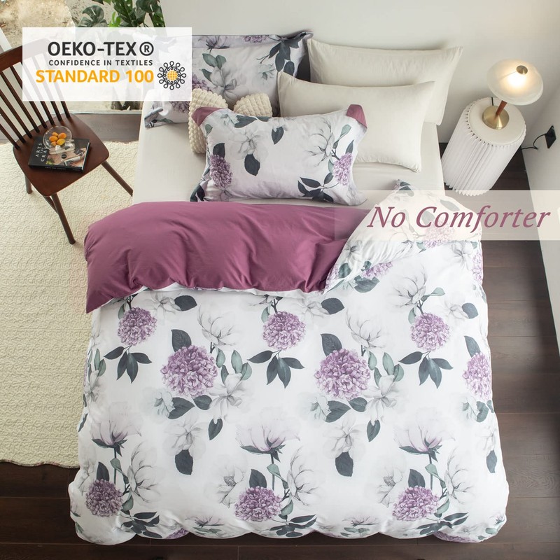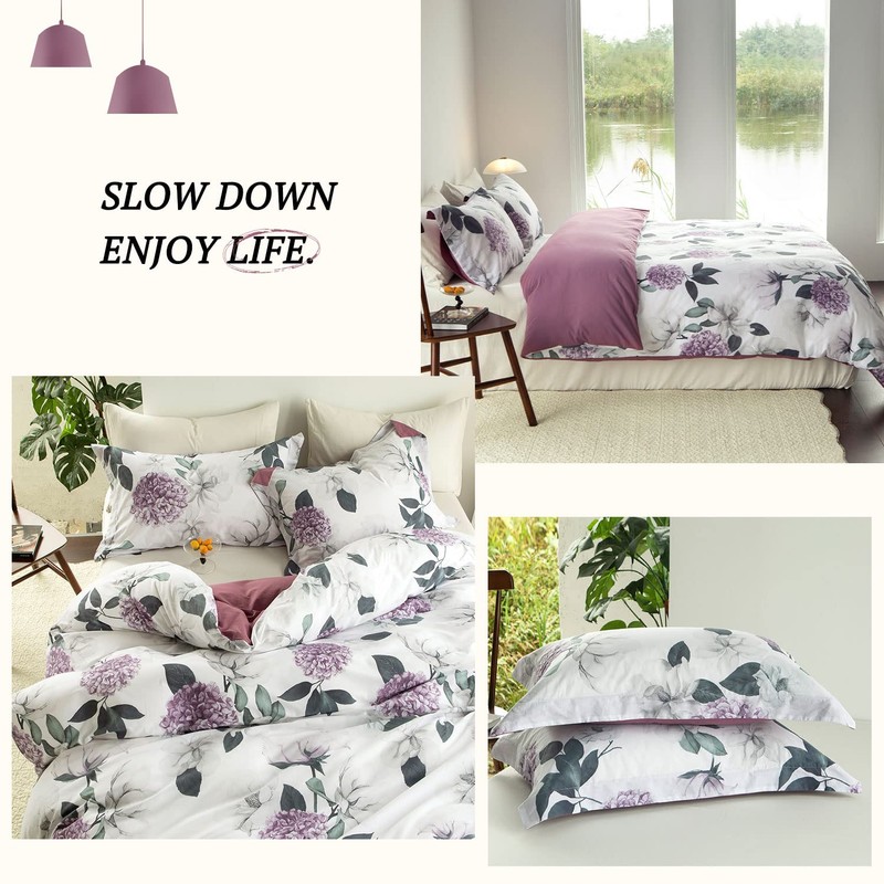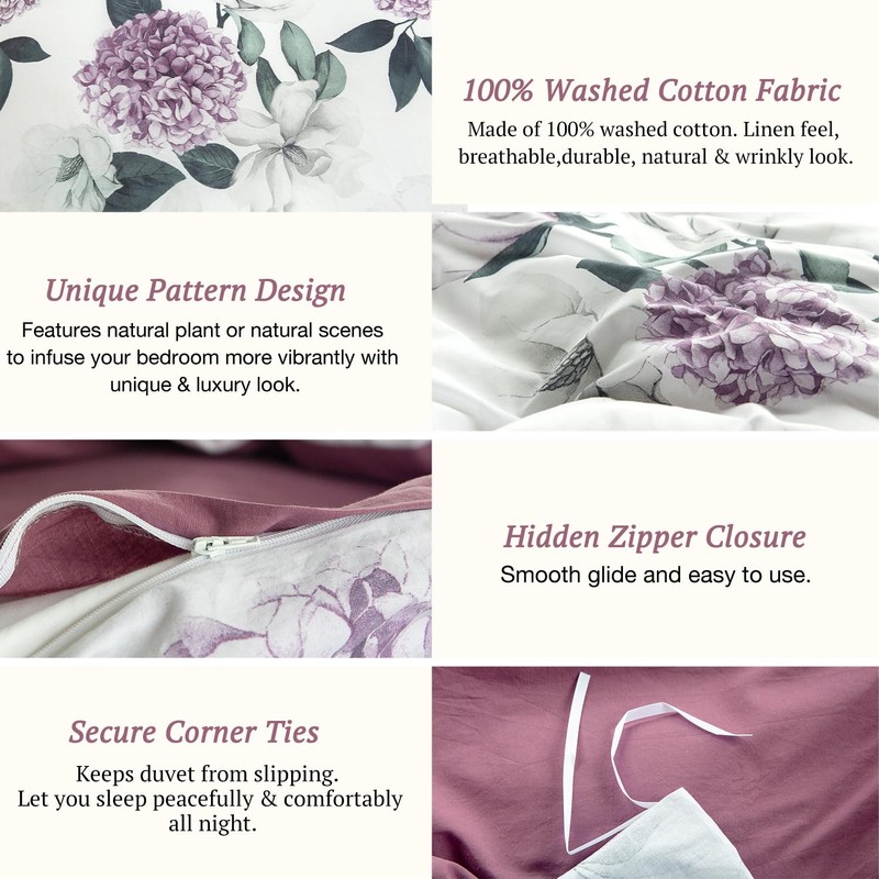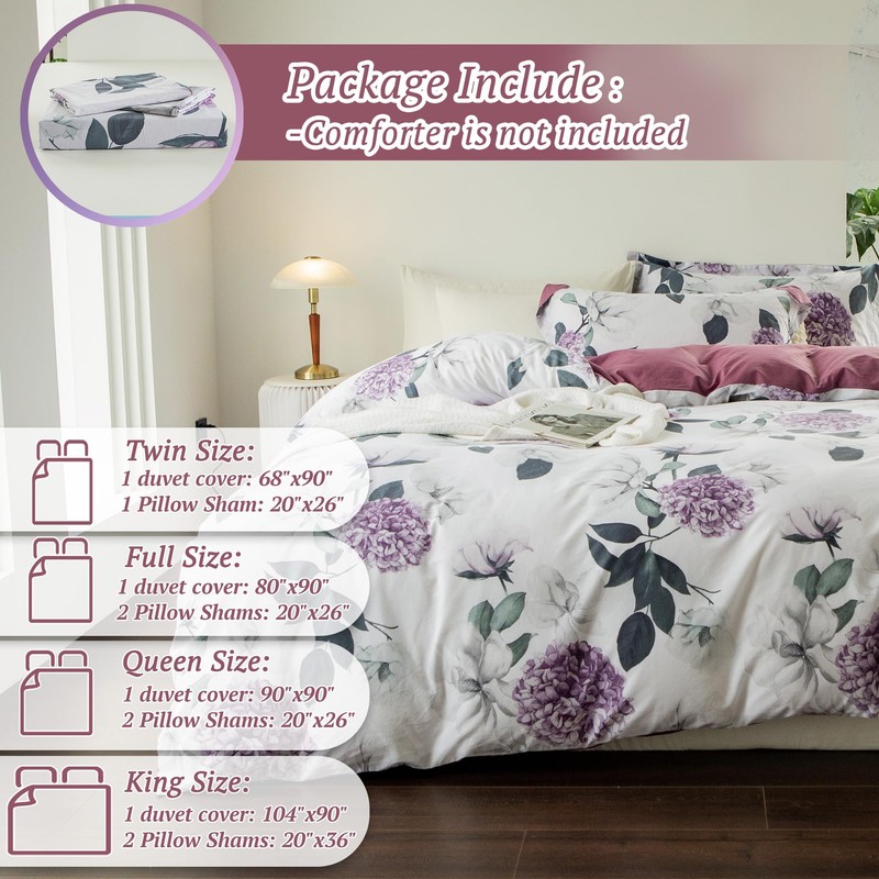 MILDLY 100% Washed Cotton Duvet Cover - Purple Hydrangea Floral Comforter Cover Set Botanical Flower Pattern Bedding Set with Zipper Closure