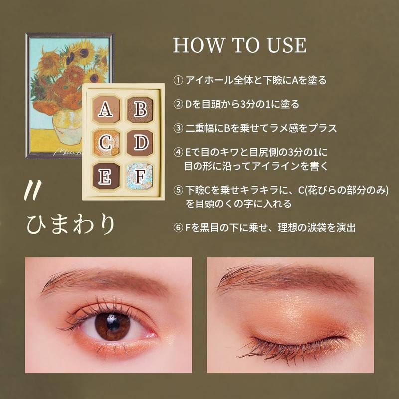 - [Carefully packaged] Book-type eyeshadow palette. Remove the eyeshadow from the case and you will see a detailed oil painting that looks like you visited to a museum. Once you open the book, you will be in the world of Van Gogh masterpiece