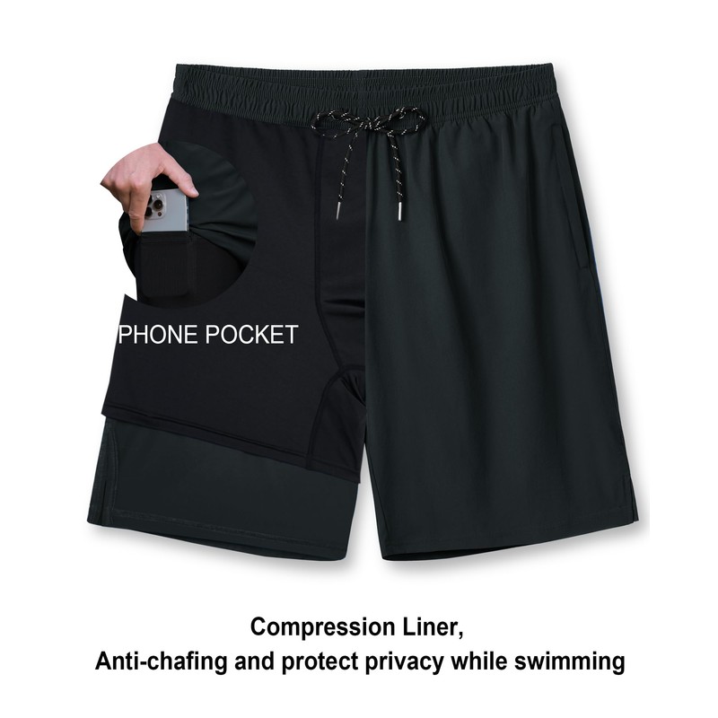 - [2 in 1 Mens Swim Trunks with Compression Liner]The mens 9 Inch swim trunks of premium fabric, which is made of polyester and spandex. Have a Stretch Built-in compression lining protects your skin from scratch and prevents from sticking to your skin when the shorts are soaked. while provides better breathability and elasticity.